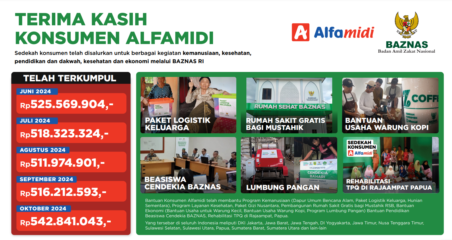 Pada periode Juni - Oktober 2024 donasi konsumen Alfamidi mencapai Rp 2.614.921.765 atau lebih dari Rp 2,6 miliar dan telah disalurkan oleh BAZNAS. Bentuk bantuan yang diberikan meliputi aspek kemanusiaan,