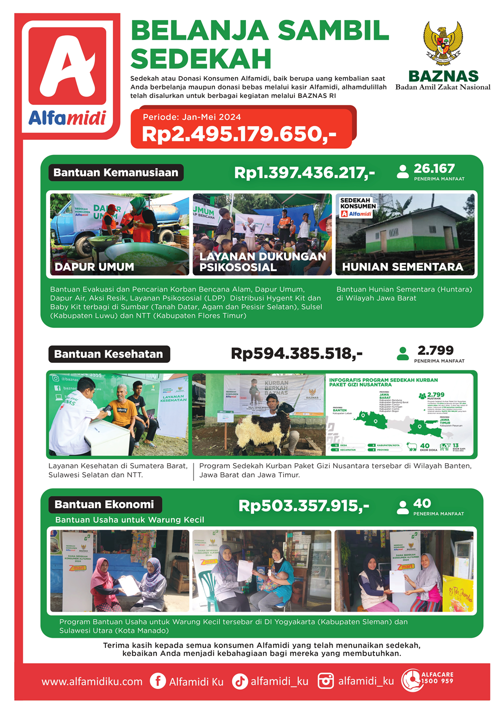 Selama periode Januari-Mei 2024 donasi konsumen Alfamidi mencapai Rp 2.495.179.650 atau lebih dari Rp 2,49 miliar dan telah disalurkan oleh kepada lebih dari 29.000 penerima manfaat. Bentuk bantuan yang diberikan meliputi